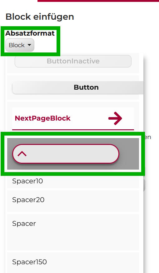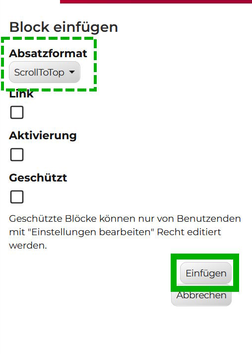 Danach kann über den Button Absatzformat auf der linken Seite der ScrollToTop - Block ausgewählt werden.