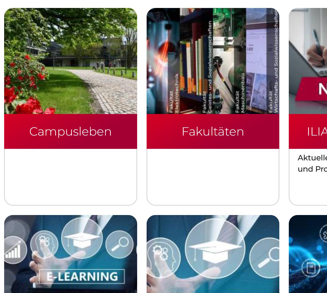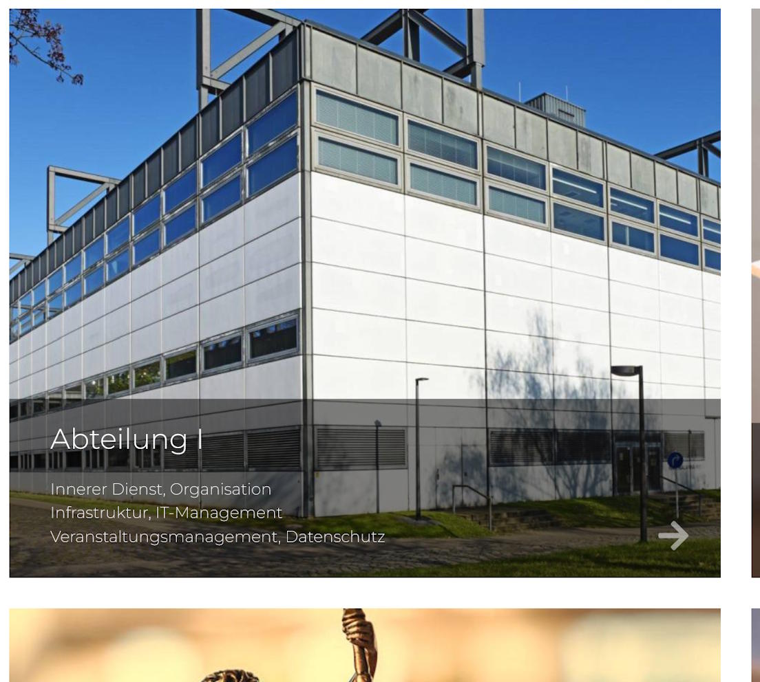 Dieses Design eigent sich, um große Bilder für Kategorien anzuzeigen. Bei uns werden diese für die Zentralen Einrichtungen, die Präsidialabteilung und die Verwaltung verwendet.